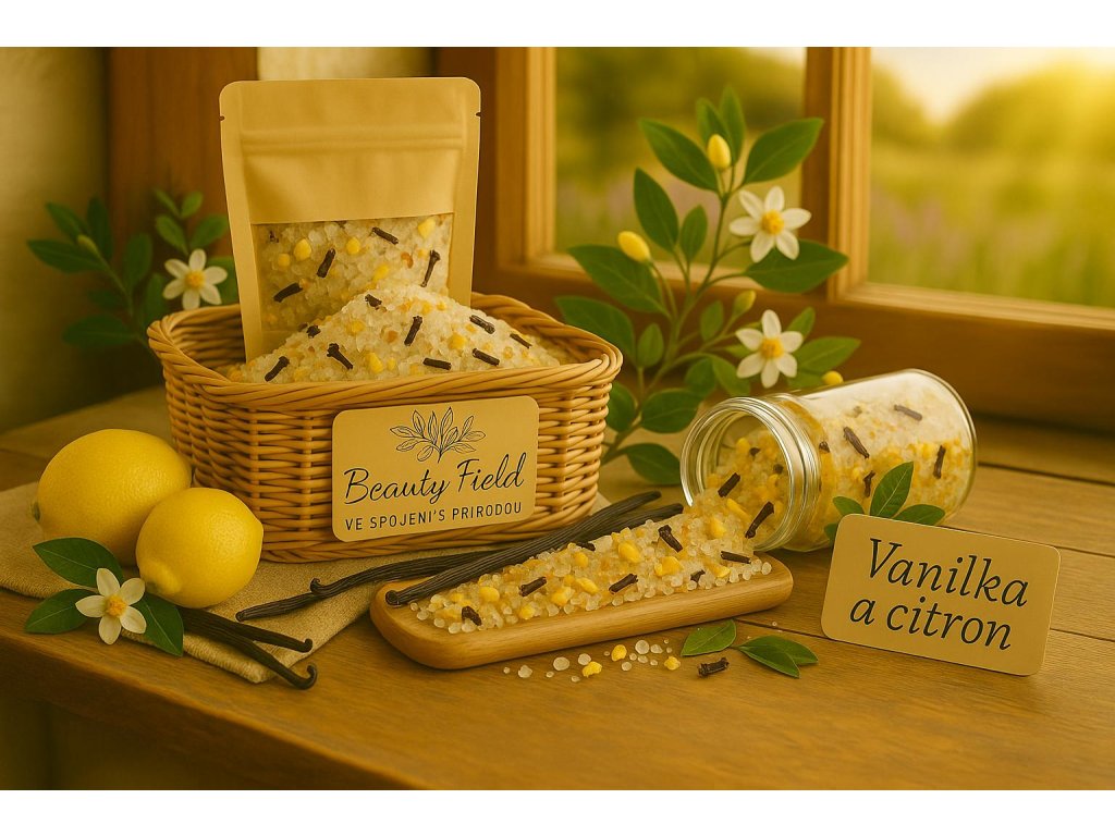 Epsomská sůl, sůl z mrtvého moře, himalájská sůl, bambucké máslo, kůra citronu, vanilkový lusk, vanilka + citron esenciální olej