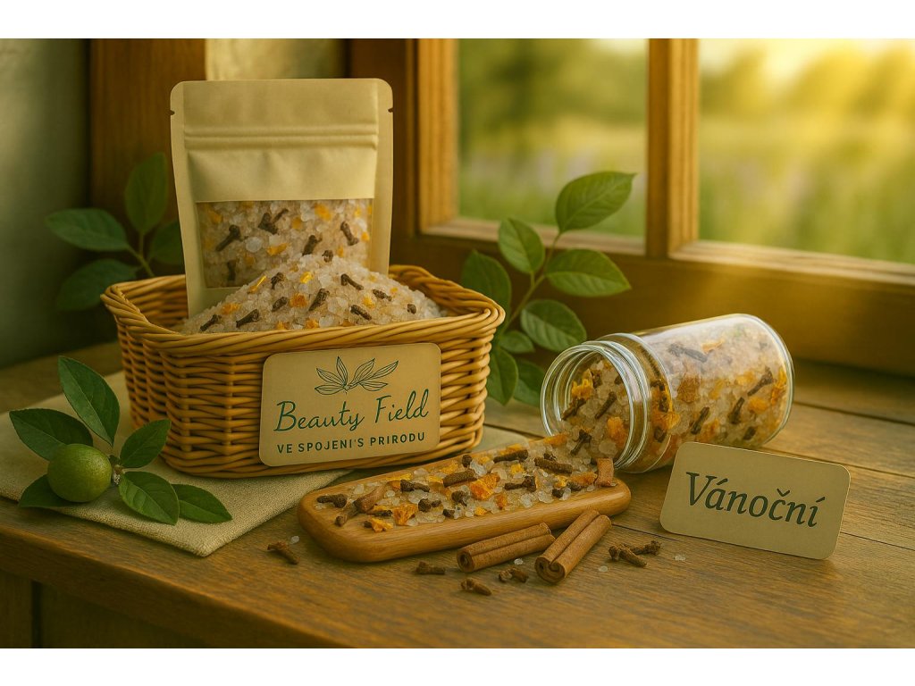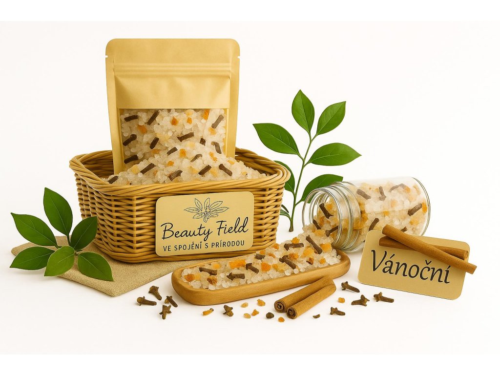 Epsomská sůl, sůl z mrtvého moře, himalájská sůl, bambucké máslo, hřebíček, skořicový esenciální olej.